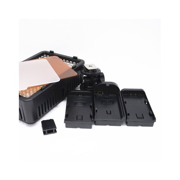 Ce panneau à LED est compatible avec plusieurs types de batterie : CANON LP-E6, NIKON EN-EL15, PANASONIC D16, SONY NP-F550 / 750/970 et il est possible de le faire fonctionner avec 6 piles AA.