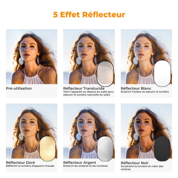 Équipé de cinq réflecteurs avec des effets différents, dont l'or, l'argent, le blanc, le noir et la couverture translucide, offrant différents effets de lumière pour votre prise de vue.