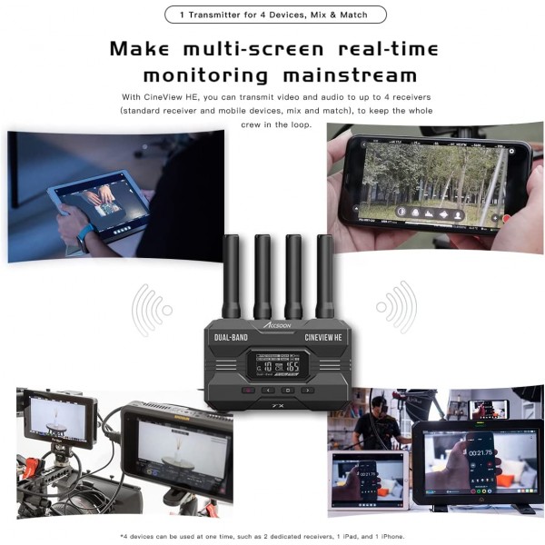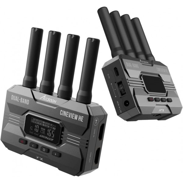Accsoon CineView HE est un kit émetteur et récepteur sans fil double bande HDMI doté d'un nouveau port USB-C sur le récepteur pour la diffusion directe en direct (UVC).